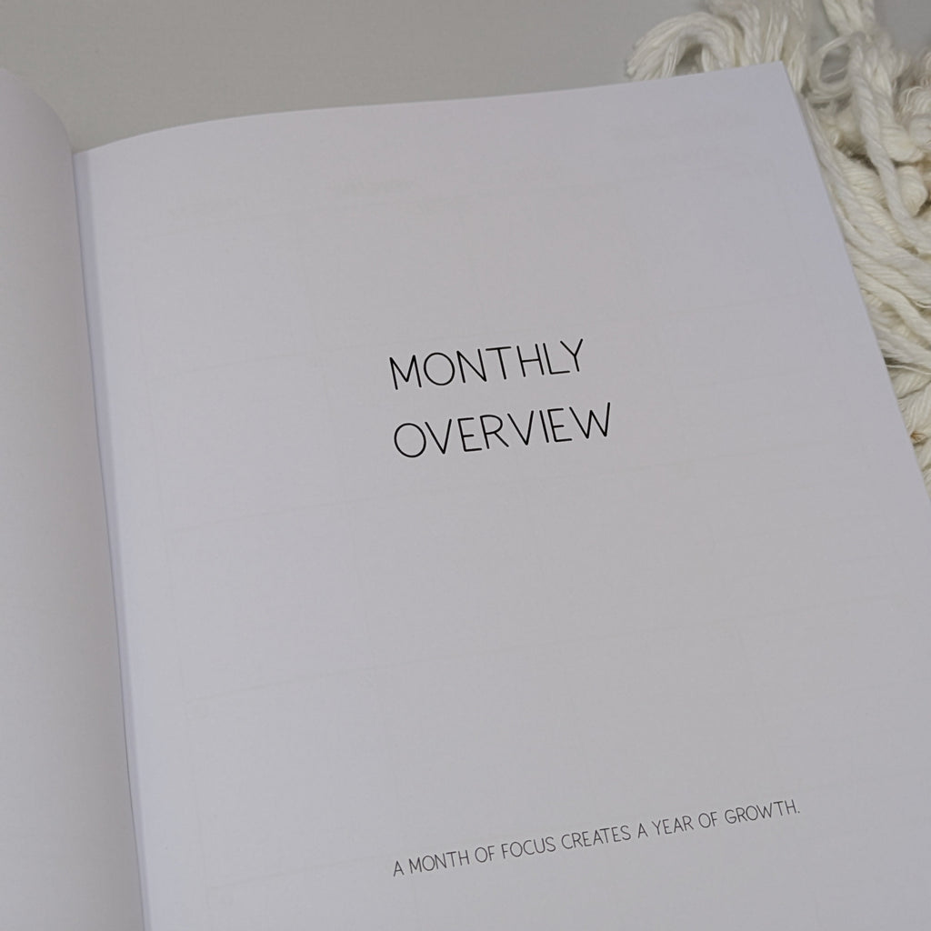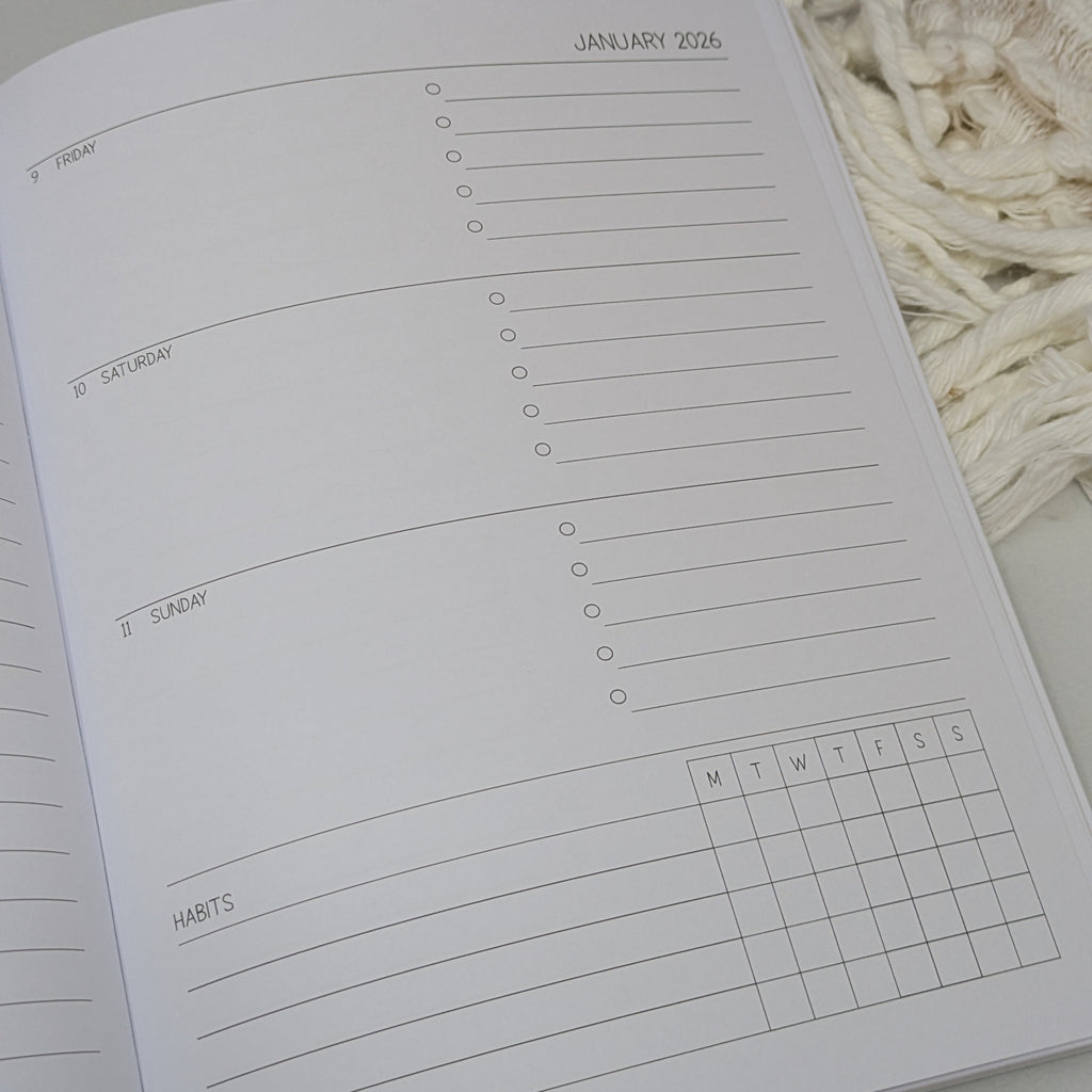 * Week on two page spreads follows for clear daily planning with a weekly habit tracker.