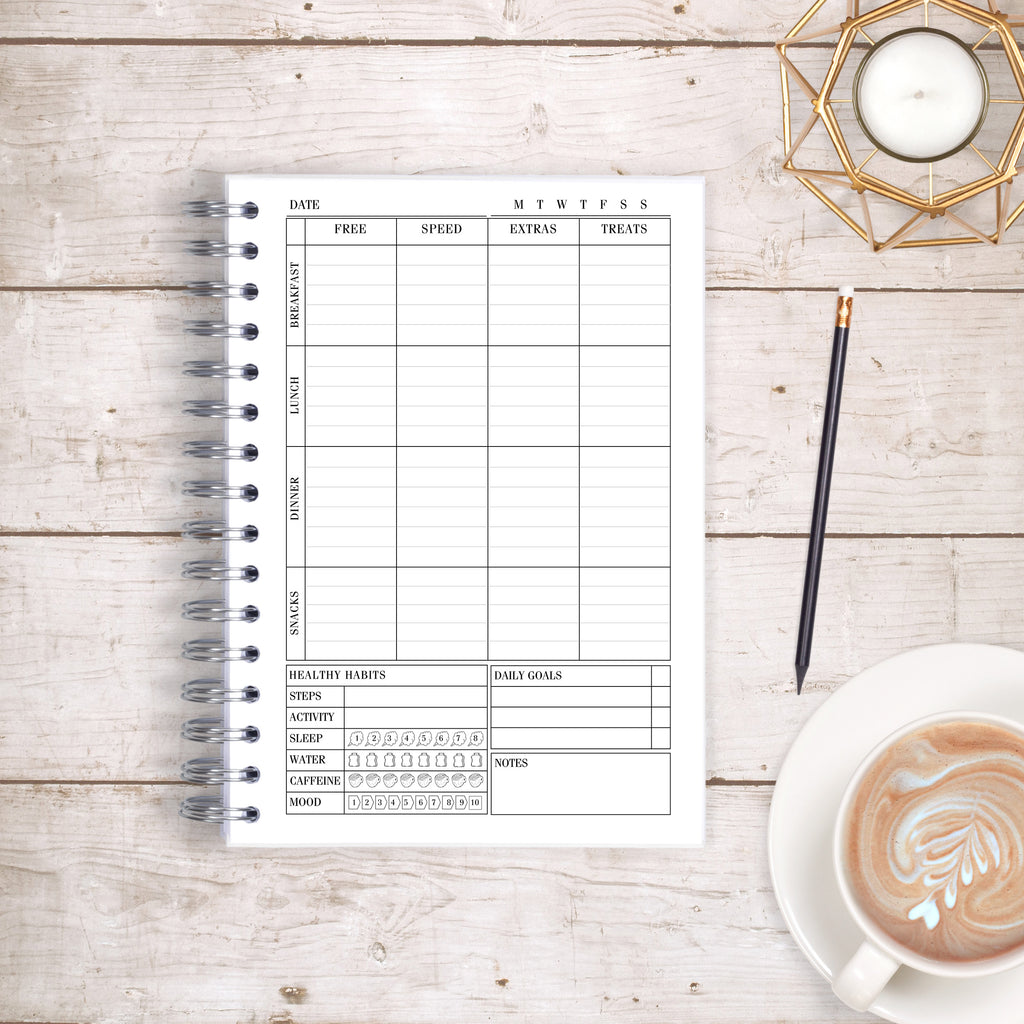 - 7 daily tracking pages – space to log breakfast, lunch, dinner, snacks, water, steps, caffeine, mood, sleep & daily goals.